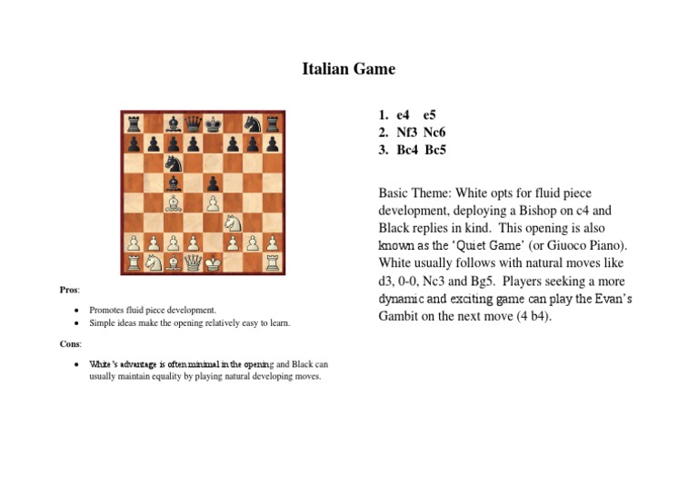 This simple scheme of development leads to a complex of systems that form one of the oldest chess openings, the italian game. By tim brennan and anthea carson. You can view the document we just created on the italian game. The italian game for beginners 4 2 introduction 5 2.1 the trouble… While this is a very active square early on, this opening can many times become a very quiet and slow game.